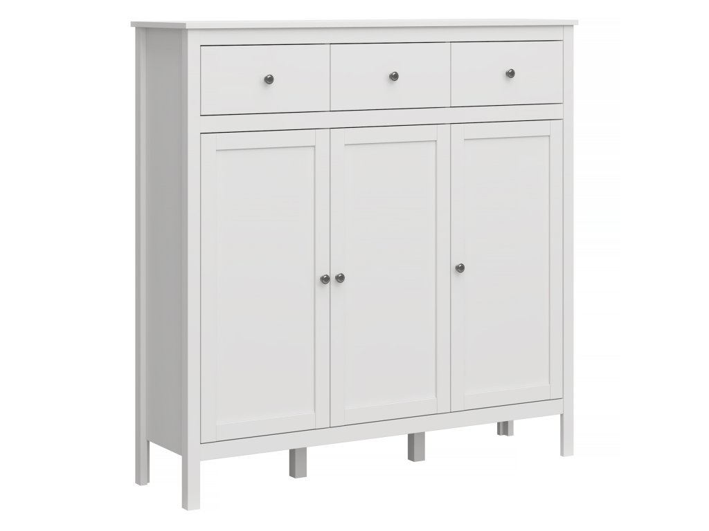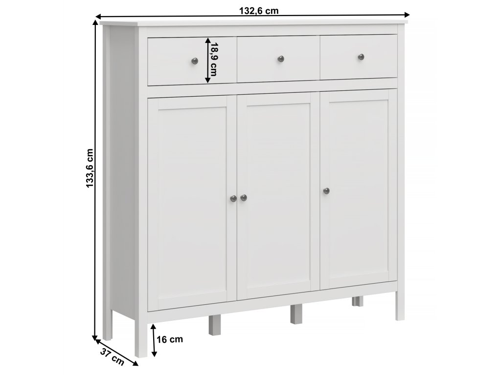 Komoda SHAEL 3D3S v bílé barvě přináší do vašeho interiéru čistotu, řád a nadčasovou eleganci. Spojuje jednoduchý moderní vzhled s praktickou funkčností, díky čemuž se hodí do ložnice, obývacího pokoje, pracovny i předsíně.