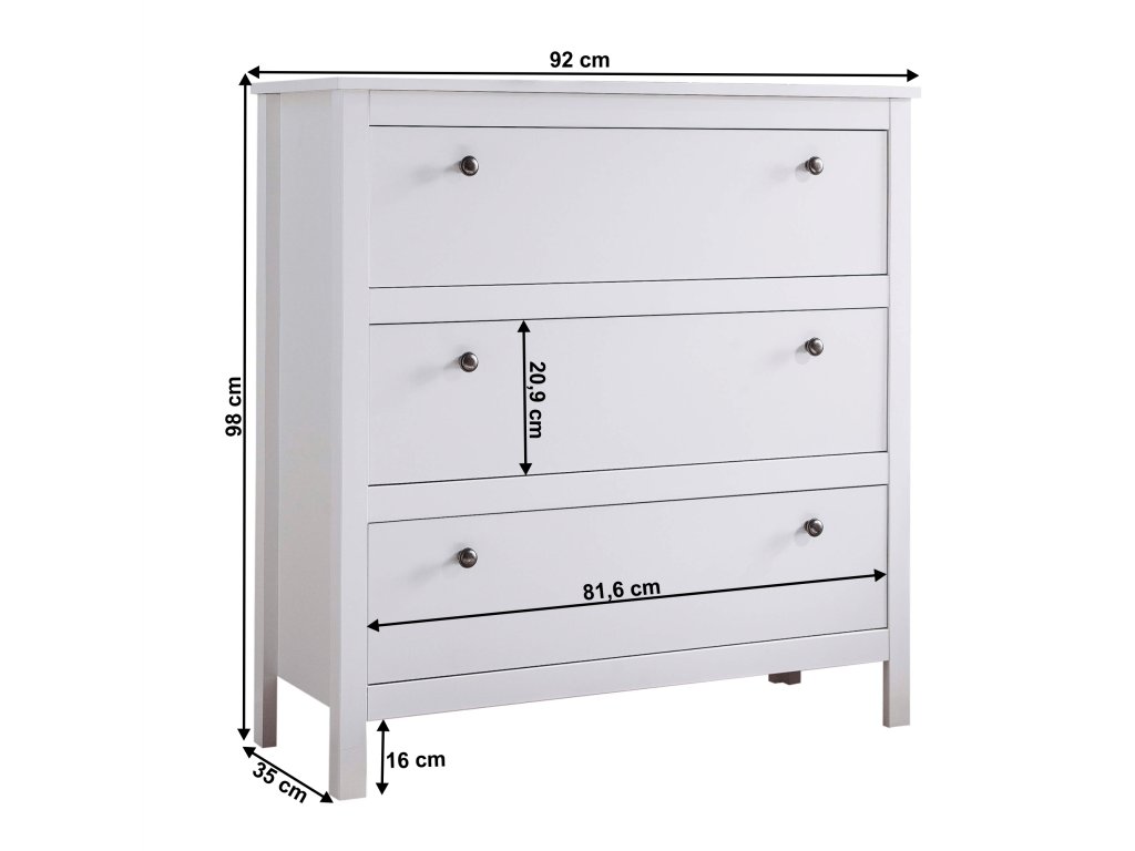 Komoda SHAEL v elegantním bílém provedení přináší do interiéru jednoduchost, čisté linie a nadčasový styl. Díky svému univerzálnímu designu se hodí do ložnice, obývacího pokoje, předsíně i dětského pokoje. Tři prostorné zásuvky poskytují dostatek místa pro oblečení, doplňky nebo domácí textil.