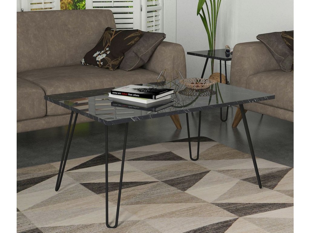 Konferenční stolek s kovovýma nožkama černé barvy, deska je vyrobena z kvalitního lamina o tl.18 mm hraněné PVC páskou, odolného proti poškrábání v barvě mramor černý. Dodáváme v demontovaném stavu.