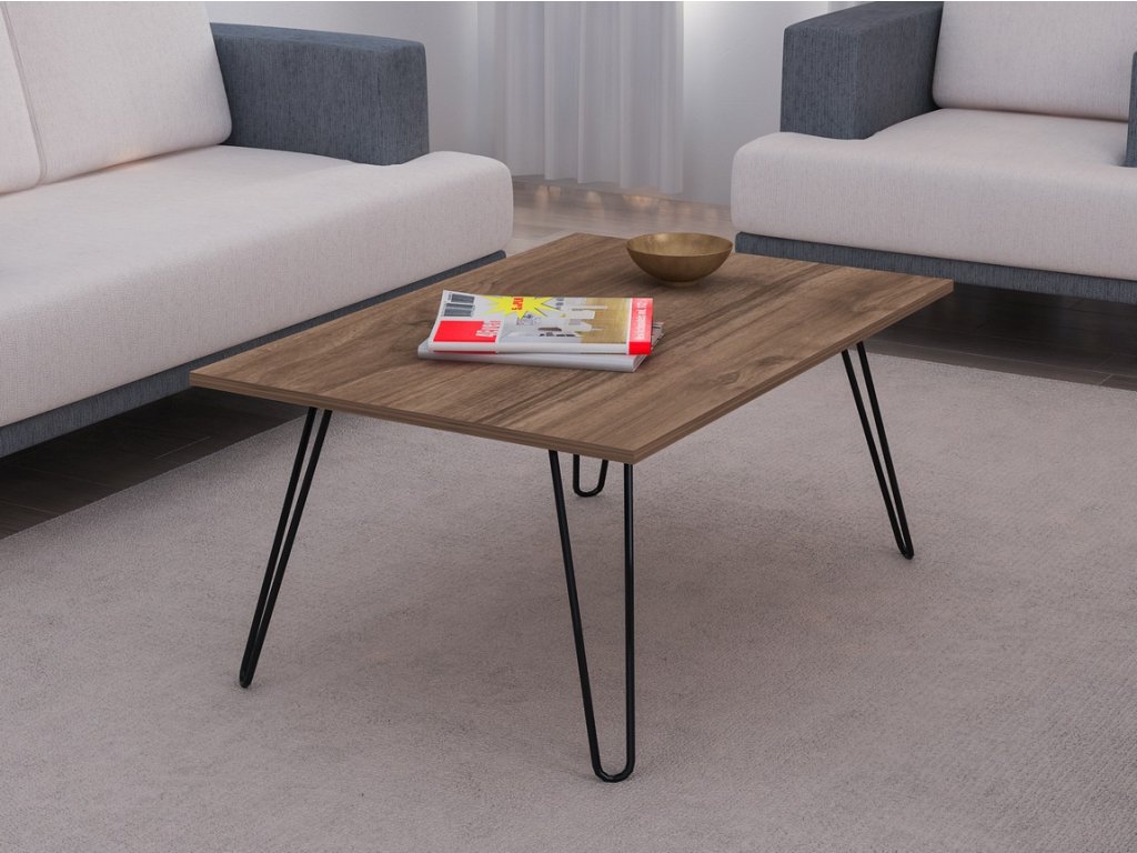Konferenční stolek s kovovýma nožkama černé barvy, deska je vyrobena z kvalitního lamina o tl.18 mm hraněné PVC páskou, odolného proti poškrábání v barvě vlašský ořech. Dodáváme v demontovaném stavu.