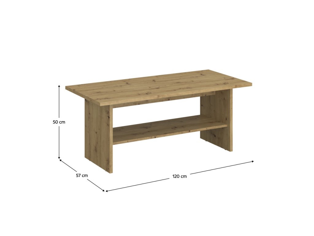 Moderní konferenční stolek LITZY přináší do vašeho obývacího pokoje styl a praktičnost. S rozměry 120x57x50 cm se hodí do menších i větších prostor a jeho elegantní dekor dub artisan dodá interiéru teplý a příjemný vzhled.