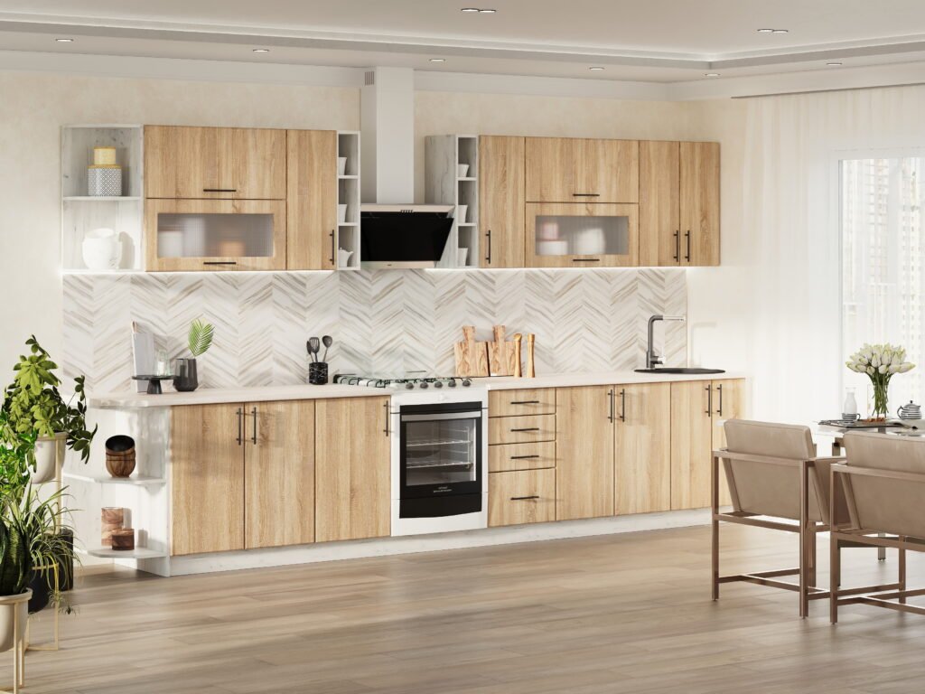 Kuchyňská linka o celkové délce 400 cm. Dodáváno včetně úchytů DR 11-128 Railing Black a pracovní desky 28 mm ve vzoru písečná duna. Součástí nejsou vyobrazené spotřebiče, dřez a baterie.