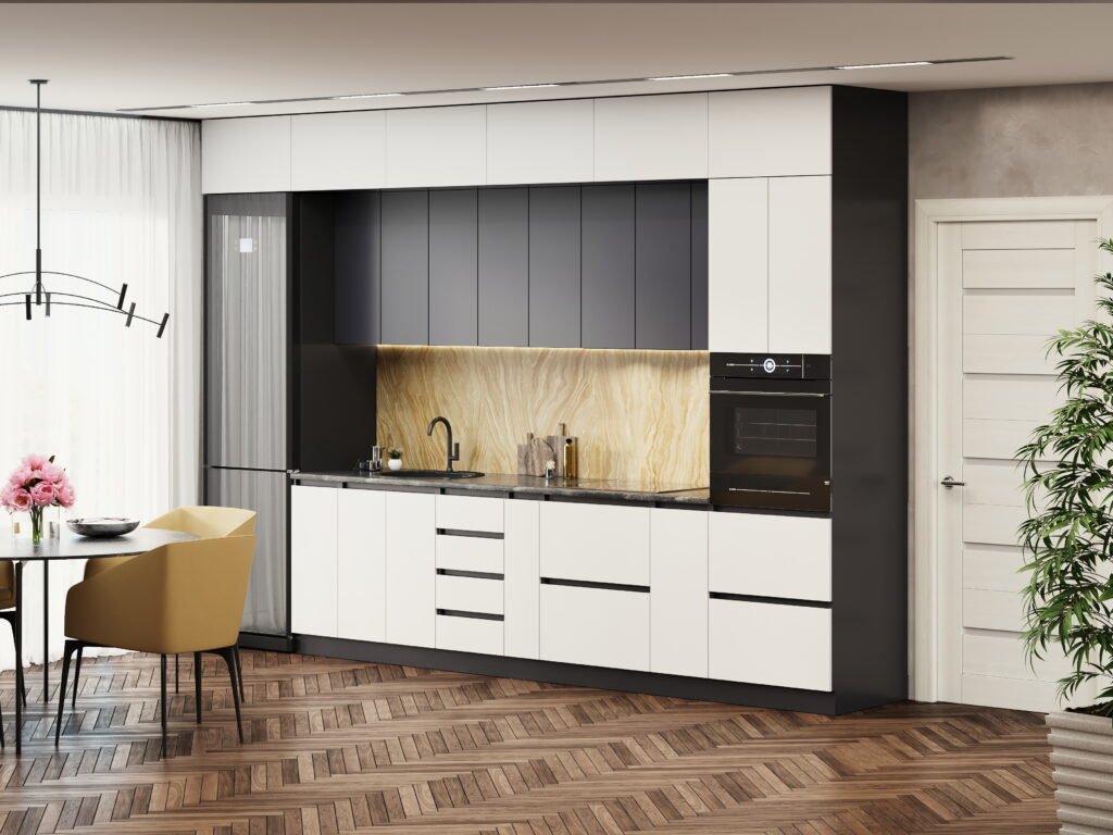 Kuchyňská linka o celkové délce 360 cm. Dodáváno včetně pracovní desky 28 mm ve vzoru beton tmavý. Součástí nejsou vyobrazené spotřebiče, dřez a baterie.