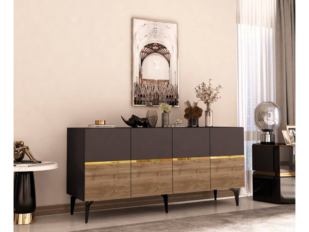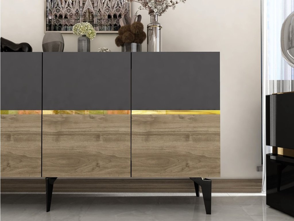Komoda MARVIN přináší do vašeho obývacího pokoje eleganci, praktičnost a nadčasový styl. Kombinace antracitové, ořechové a zlaté barvy vytváří harmonický kontrast, který působí luxusně a zároveň moderně.