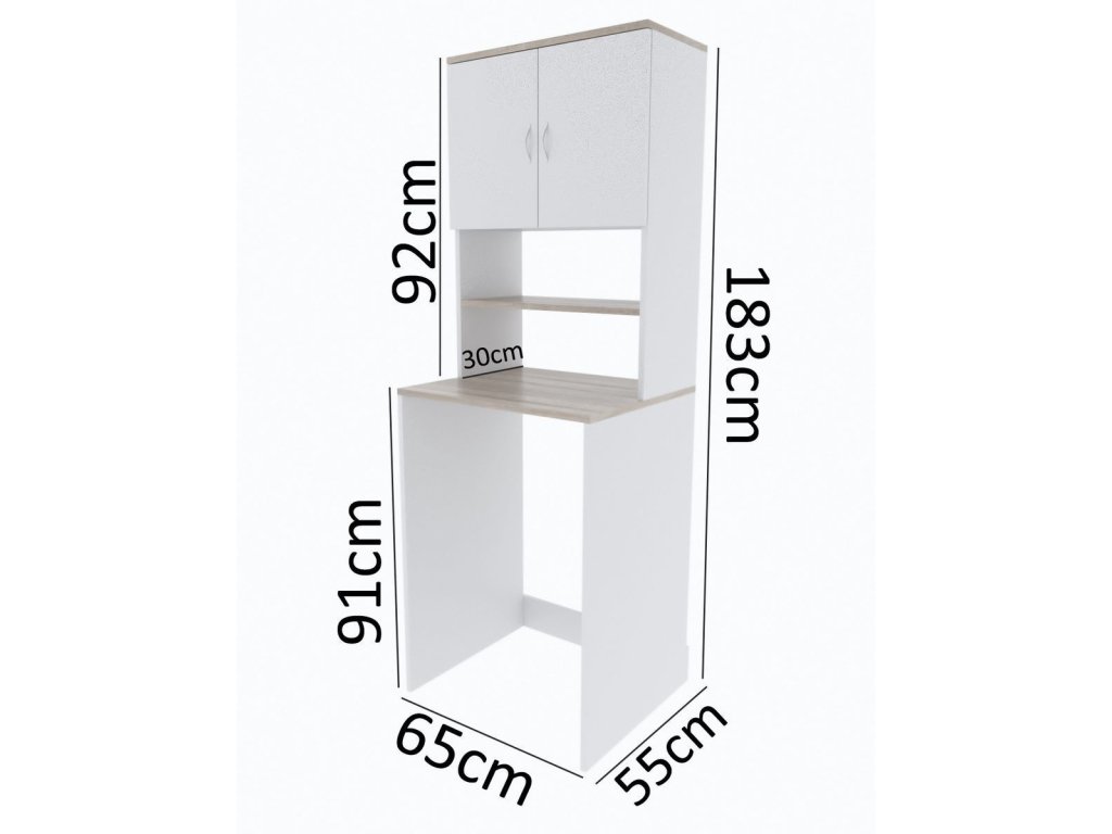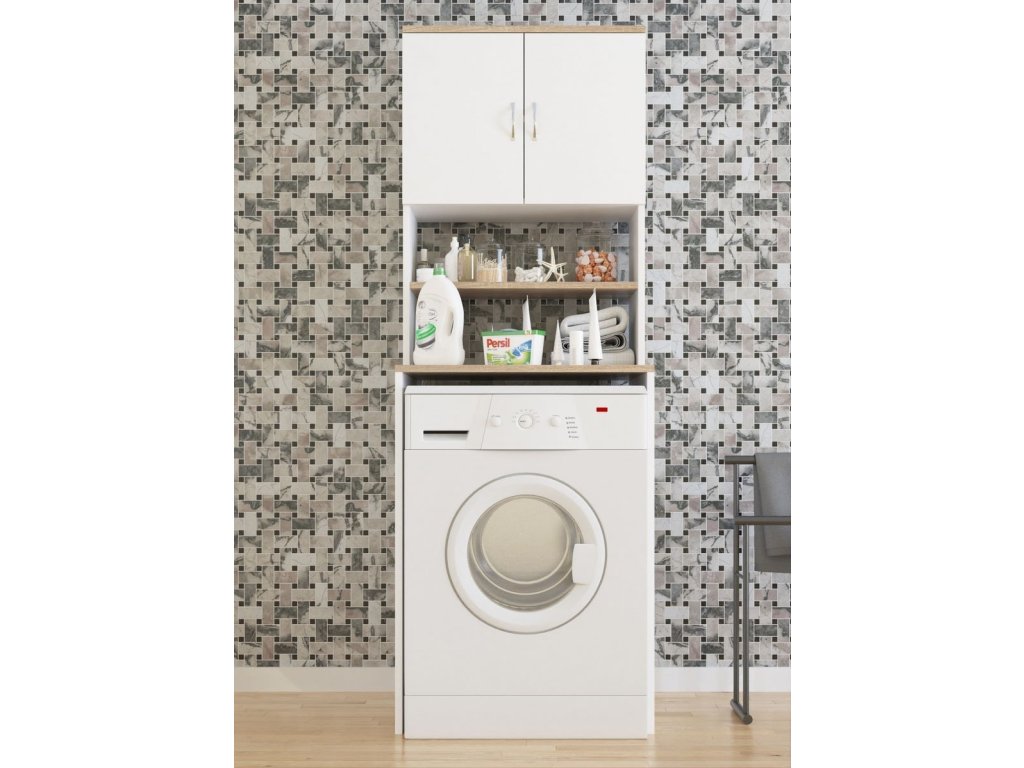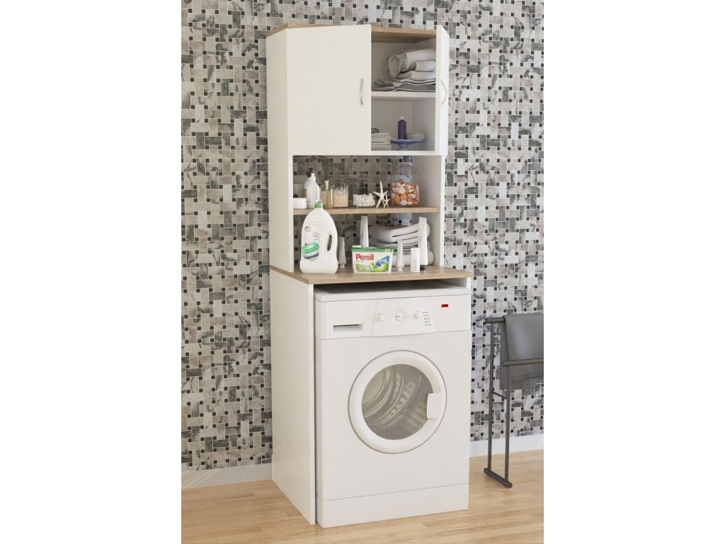 Koupelnová skříň s policemi a vrchní skříňkou vhodná i pro umístění nejen pračky, rozměry 65 × 55 × 183 cm.
