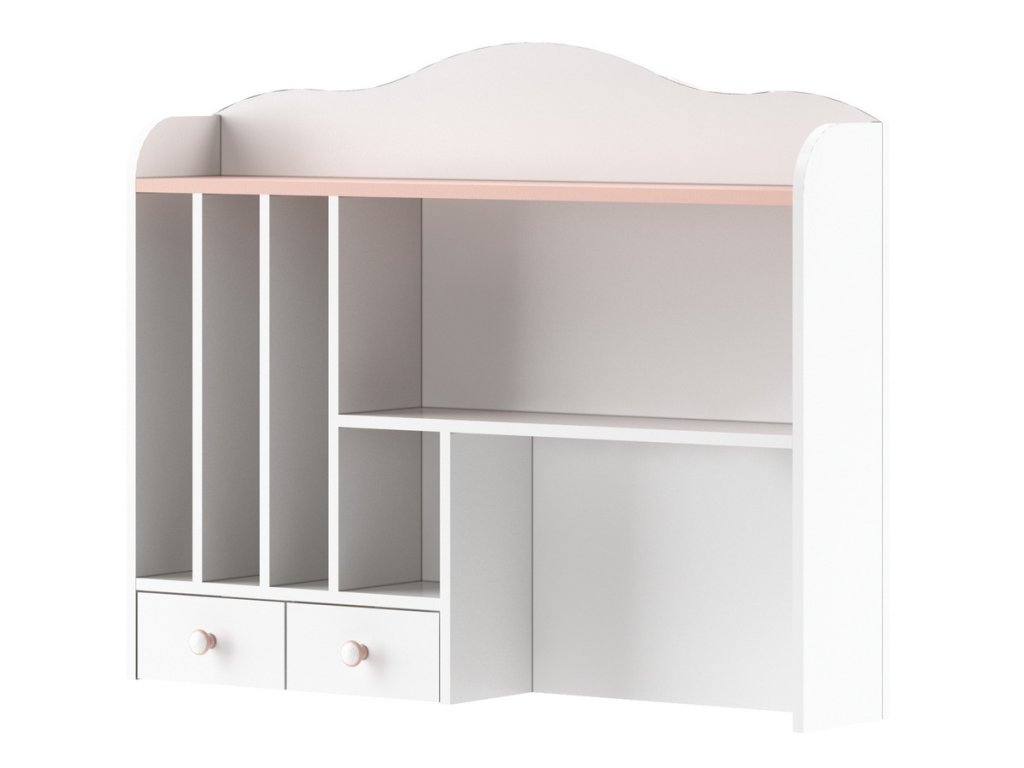 Díky dvěma prostorným zásuvkám a několika praktickým poličkám nabízí dostatek místa pro sešity, učebnice, hračky nebo dekorace. Vyroben je z kvalitního lamina s odolnou ABS hranou, která chrání před poškozením a zvyšuje životnost nábytku. Elegantní obloukový tvar horní části dodává celému kusu jemný a moderní vzhled, ideální do dívčího pokoje.