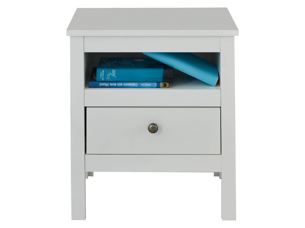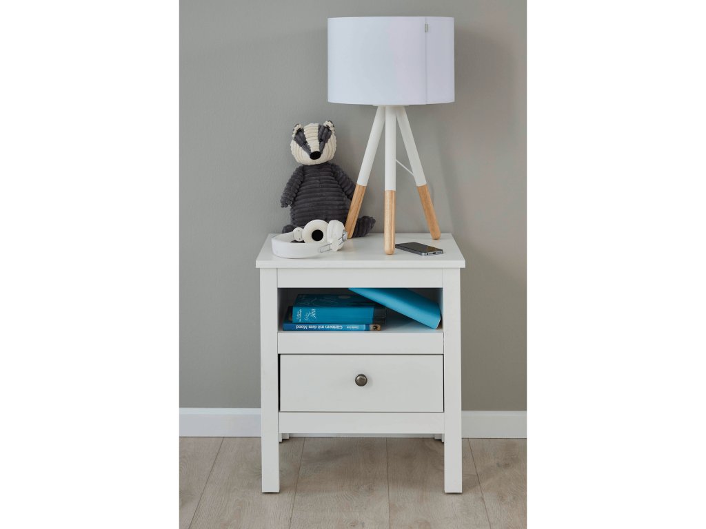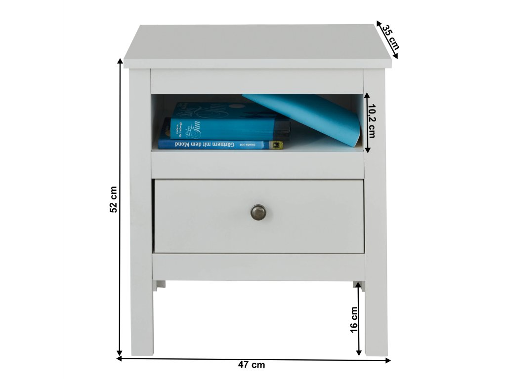 Noční stolek SHAEL v bílé barvě je ideálním doplňkem pro moderní i klasicky laděné interiéry. Je vyroben z odolné DTD laminované desky s kvalitními ABS hranami a pevnými MDF dvířky, což zaručuje stabilitu a dlouhou životnost. Praktický šuplík a otevřená odkládací plocha poskytují dostatek prostoru pro uložení knih, doplňků či drobností, které chcete mít po ruce.
