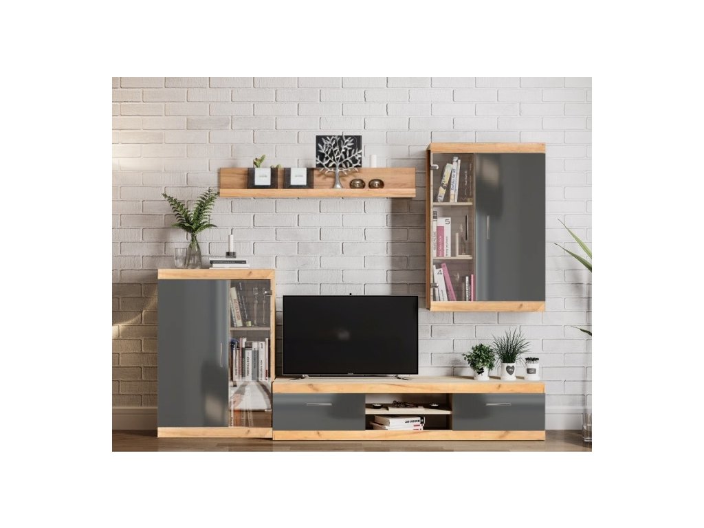 Tato obývací stěna je ideálním řešením pro vytvoření moderního prostředí ve vašem obýváku, které vám nabídne velké množství úložného prostoru a odkladné plochy. Její design je zajímavý svým přírodním dekorem dub artisan (korpus) v kombinaci s dvířky v barvě šedá lesk (antracit). Sestava se skládá z - TV stolku , police, závěsné vitríny a nízké vitríny. Tato stěna se prodává jako sestava, jednotlivé díly nelze koupit zvlášť. Dodáváme v demontovaném stavu. DOPRODEJ!