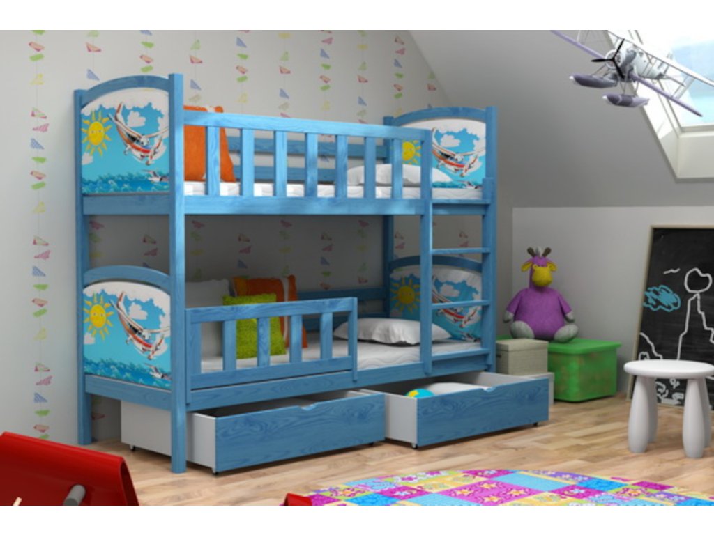Horní lůžko je opatřeno ochrannou zábranou, která zvyšuje bezpečnost při spaní. Součástí produktu jsou laťové rošty. Postel je dodávána bez potisku, s bílou deskou, bez zásuvek, matrací, doplňků a textilií. Pokud je zábrana vyobrazena, je vždy součástí balení.