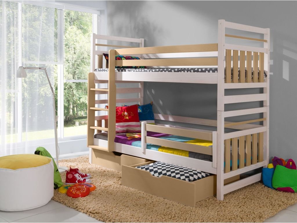 Tato patrová postel představuje ideální kombinaci funkčnosti, kvality a jednoduchého designu. Konstrukce je vyrobena z odolného masivního borovicového dřeva, které je ošetřeno akrylovým lakem. Ten zajišťuje hladký povrch, ochranu proti opotřebení a dlouhou životnost i při každodenním používání.