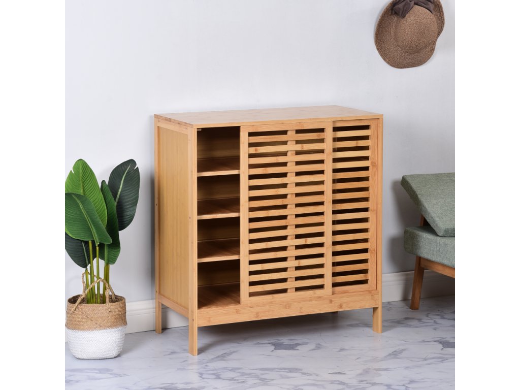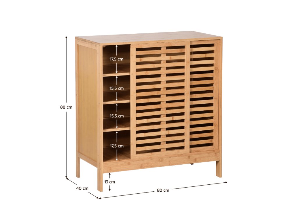 Udržujte předsíň přehlednou a vkusnou s policovým botníkem NALDO z lakovaného bambusu. Tento čtyřpolicový botník s posuvnými dvířky poskytuje dostatek prostoru pro obuv i doplňky a zároveň působí elegantně a přirozeně.