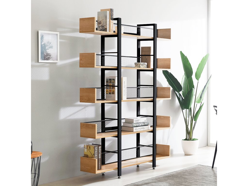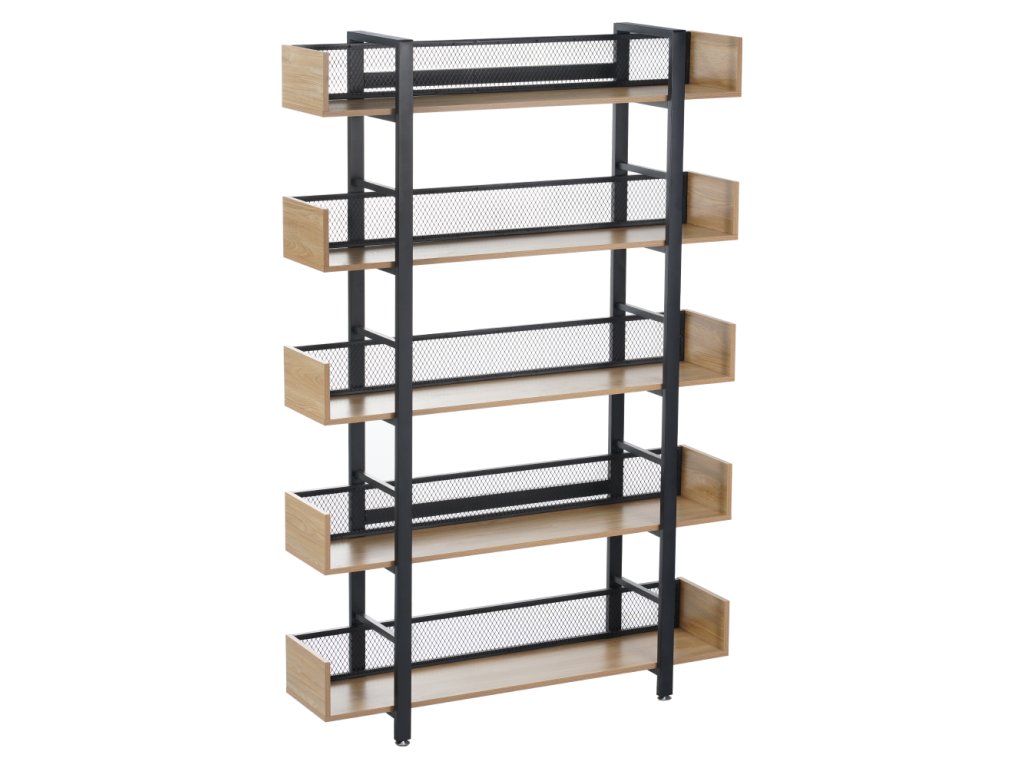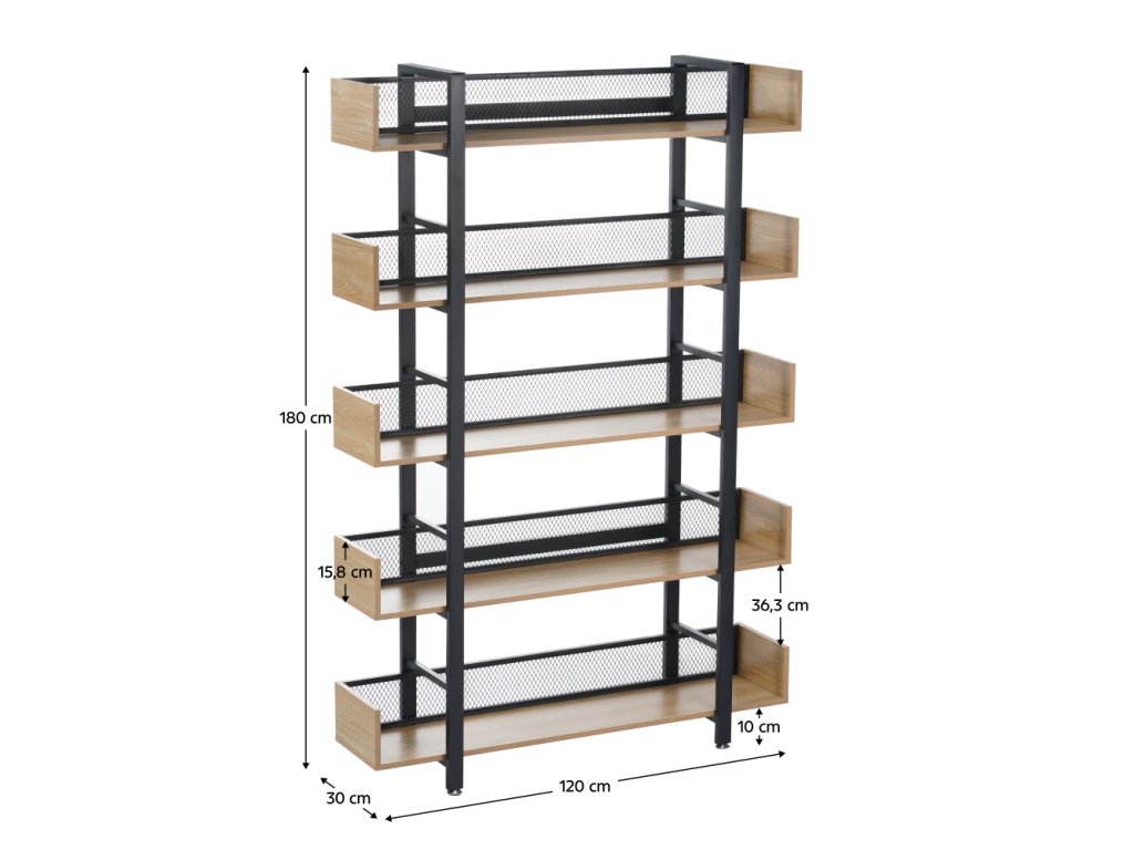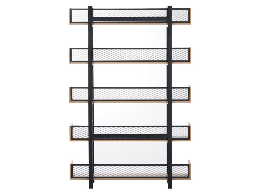 Robustní kovová konstrukce zajišťuje stabilitu, zatímco 5 prostorných polic nabízí dostatek místa pro knihy, dekorace, rostliny i úložné boxy. Zadní část je opatřena kovovou síťkou, která chrání uložené předměty a zároveň podtrhuje industriální vzhled.