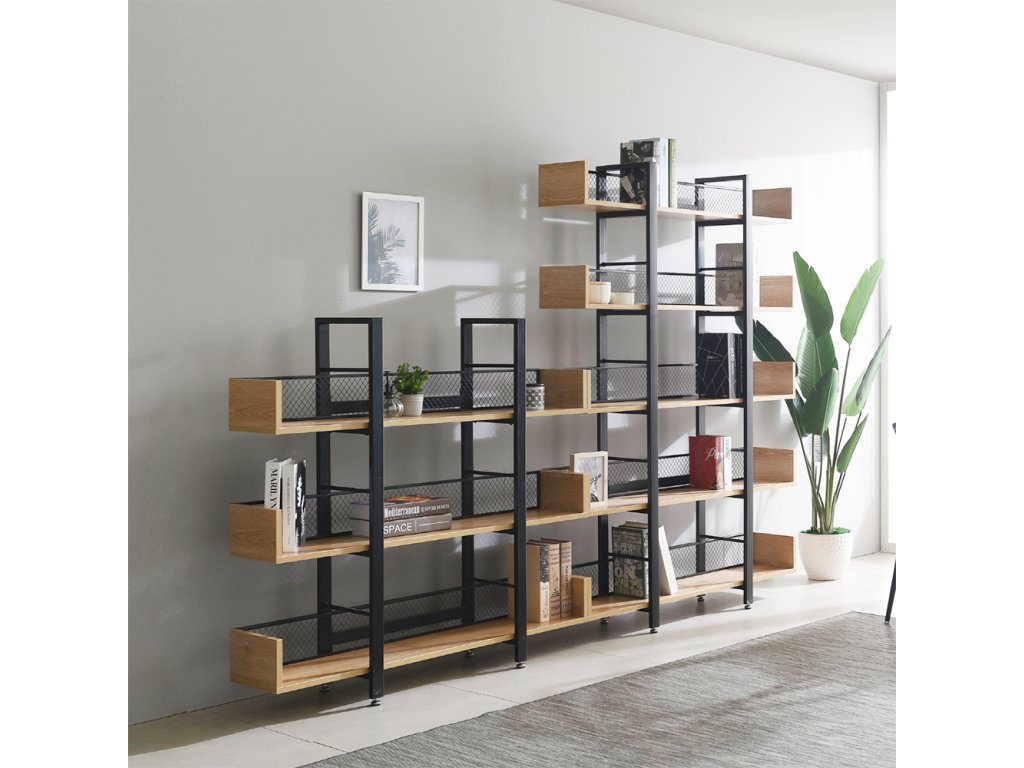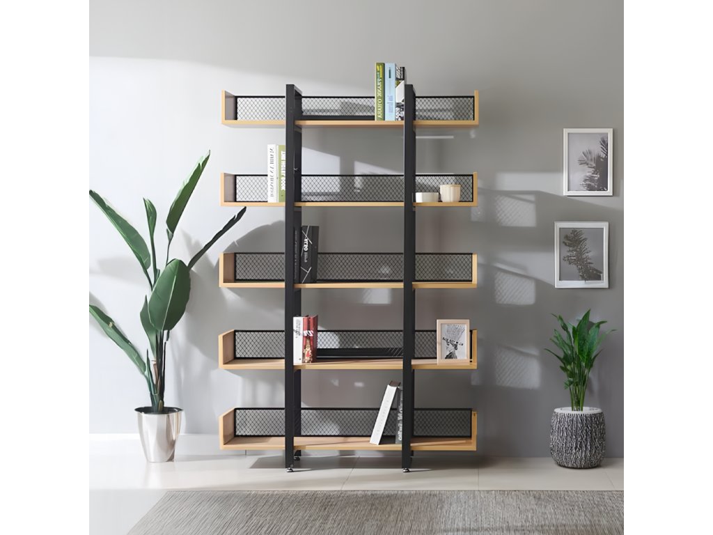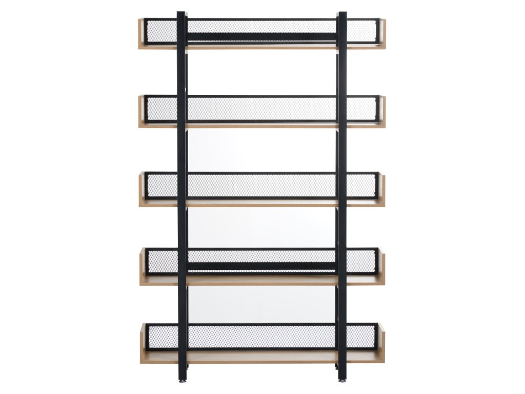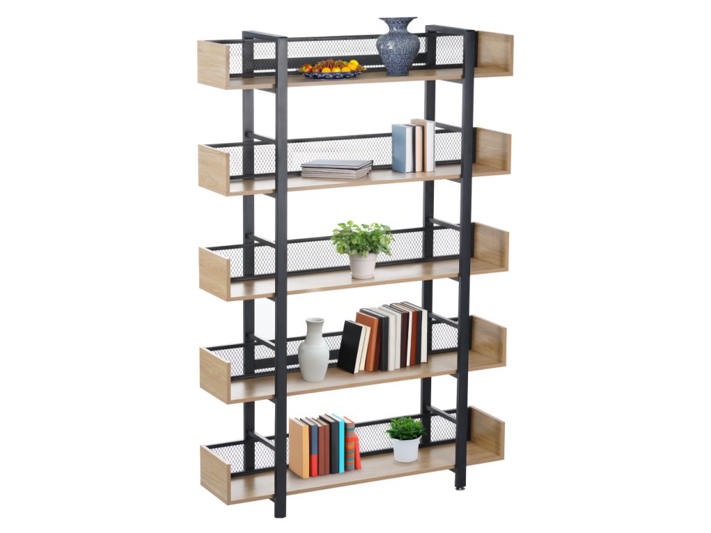 Robustní kovová konstrukce zajišťuje stabilitu, zatímco 5 prostorných polic nabízí dostatek místa pro knihy, dekorace, rostliny i úložné boxy. Zadní část je opatřena kovovou síťkou, která chrání uložené předměty a zároveň podtrhuje industriální vzhled.