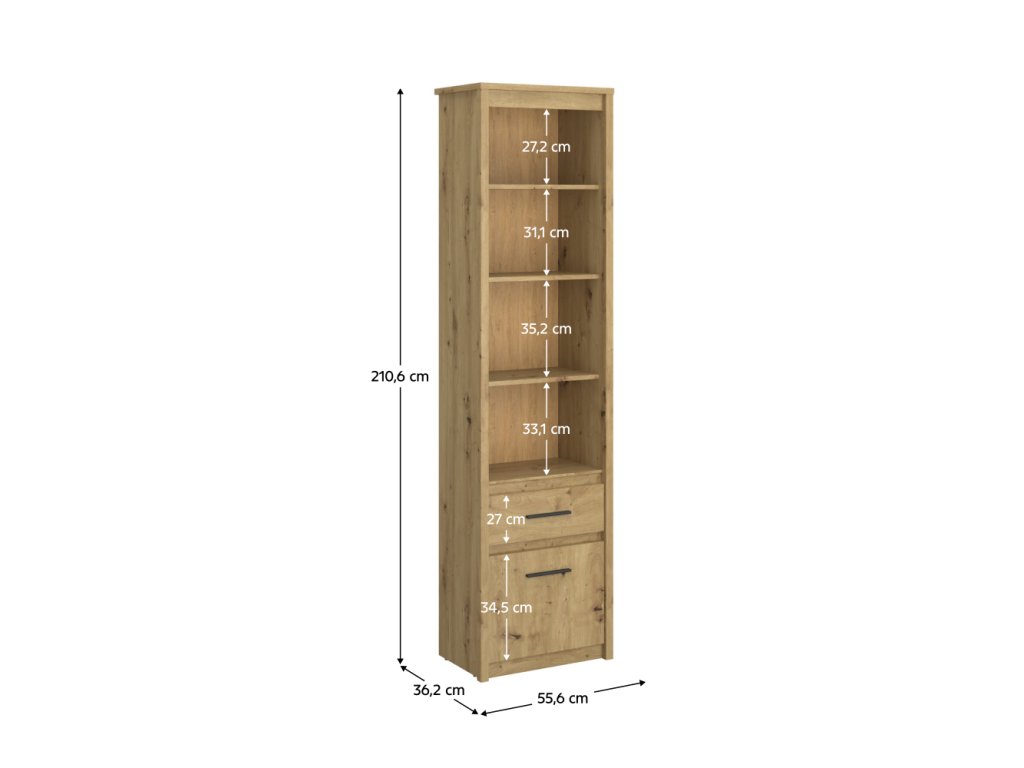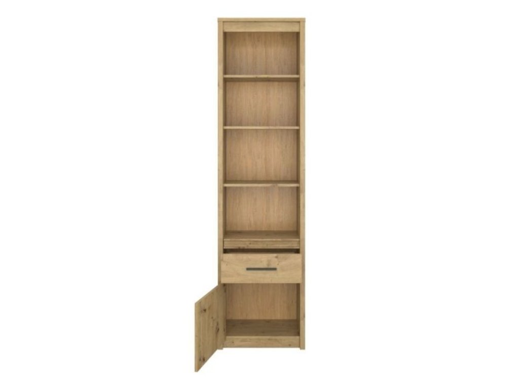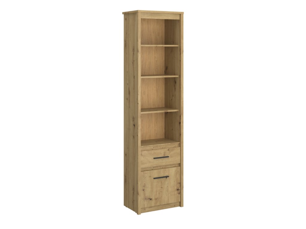 Policový regál LITZY 1D1S v dekoru dub artisan nabízí kombinaci otevřeného i uzavřeného úložného prostoru pro efektivní uspořádání knih, dekorací a dalších drobností. Praktický šuplík s výškou 27 cm a skříňka s dvířky umožňují diskrétní ukládání předmětů, zatímco otevřené police poskytují prostor pro vystavení oblíbených dekorací.