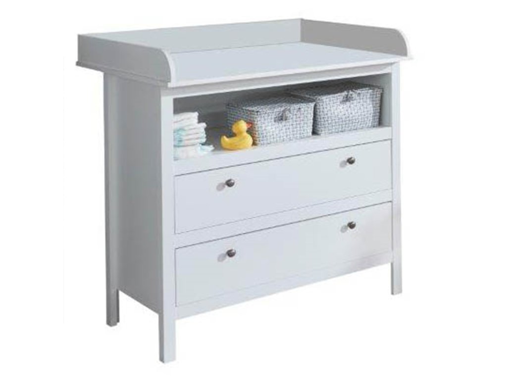 Komoda je vybavena dvěma šuplíky, otevřeným úložným prostorem a odnímatelným přebalovacím pultem. Jakmile přebalovací období skončí, pult lze jednoduše odebrat a komodu dále používat jako praktický kus nábytku.
