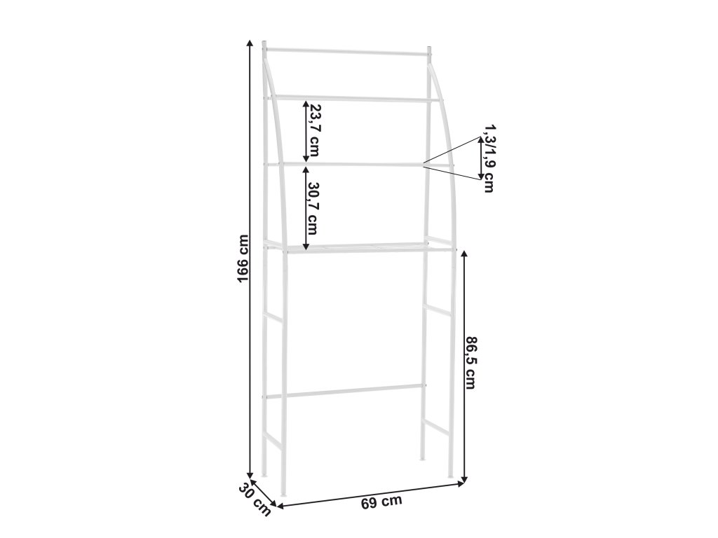 Hledáte chytré řešení pro úložný prostor v koupelně? Regál nad pračku ARWEL v elegantní bílé barvě je vyroben z kvalitního kovu, který zajišťuje pevnost a dlouhou životnost. S rozměry 69x30x166 cm je ideální nad pračku nebo toaletu a efektivně využívá každý centimetr prostoru.