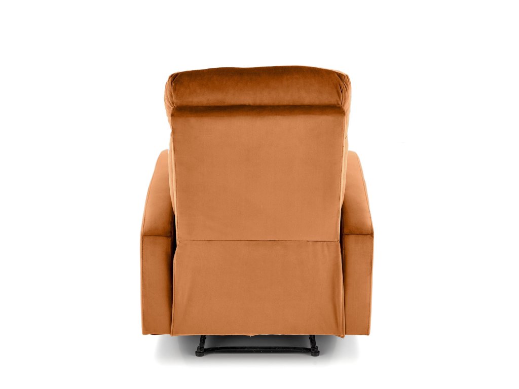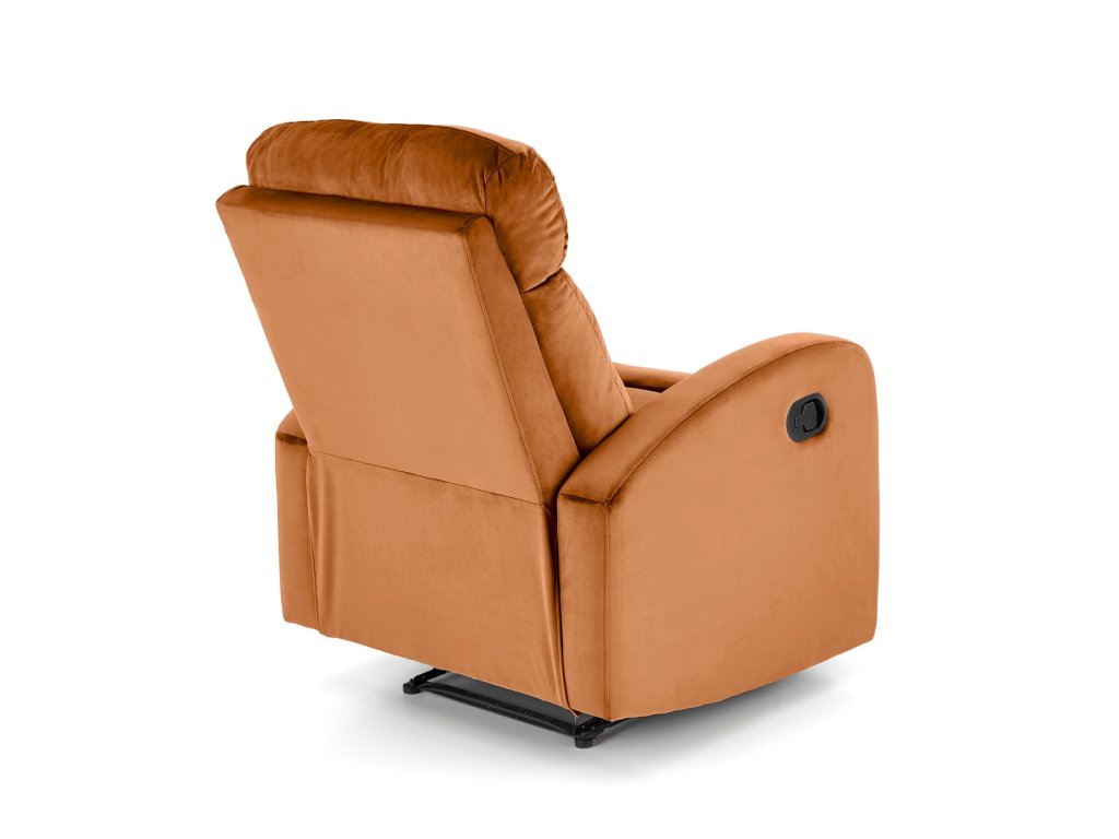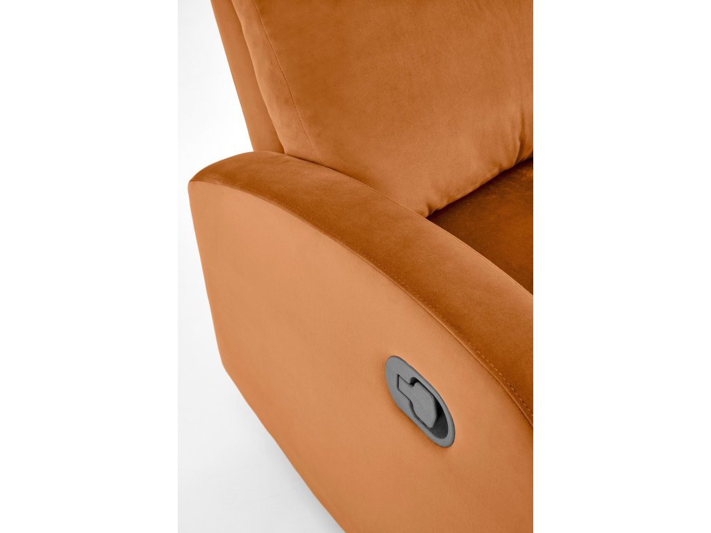 Křeslo je čalouněné měkkou sametovou látkou v nadčasové skořicové barvě, která vnáší do prostoru příjemnou atmosféru a pocit luxusu. Polstrované područky poskytují oporu rukám, což zvyšuje celkový komfort při odpočinku. Kompaktní rozměry 75 × 95–140 × 98 cm činí křeslo vhodným i do menších interiérů.