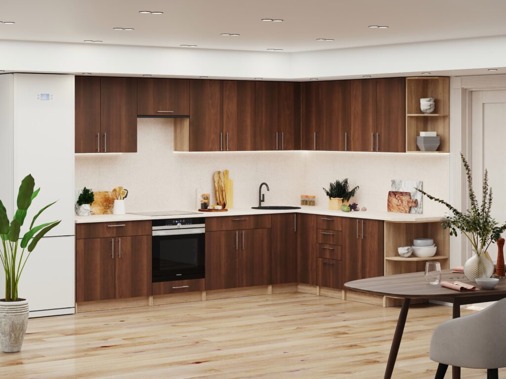 Rohová kuchyňská linka o celkové délce 310 x 220 cm. Dodáváno včetně úchytů DR 11-128 Railing Steel a pracovní desky 28 mm ve vzoru pouštní duna. Součástí nejsou vyobrazené spotřebiče, dřez a baterie.