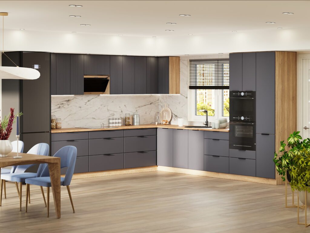 Rohová kuchyňská linka o celkové délce 300 x 340 cm. Dodáváno včetně úchytů GIFF 1/268/128 a pracovní desky 28 mm ve vzoru dub tacho. Součástí nejsou vyobrazené spotřebiče, dřez a baterie.