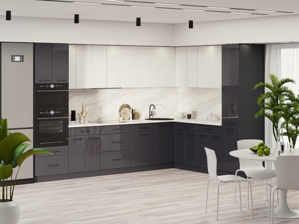 Rohová kuchyňská linka MIKO MDF 330 x 220, antracit lesk + bílá lesk + antracit
