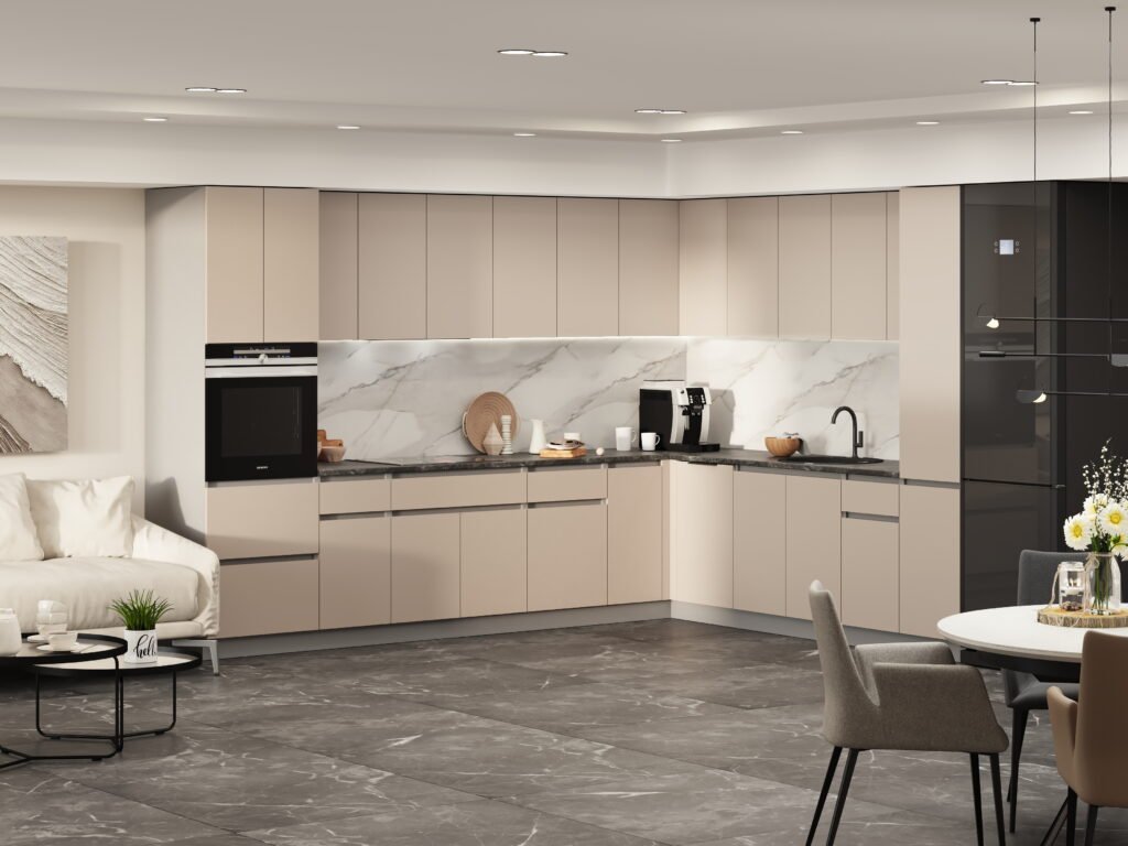 Rohová kuchyňská linka o celkové délce 330 x 270 cm. Dodáváno včetně pracovní desky 28 mm ve vzoru beton tmavý. Součástí nejsou vyobrazené spotřebiče, dřez a baterie.
