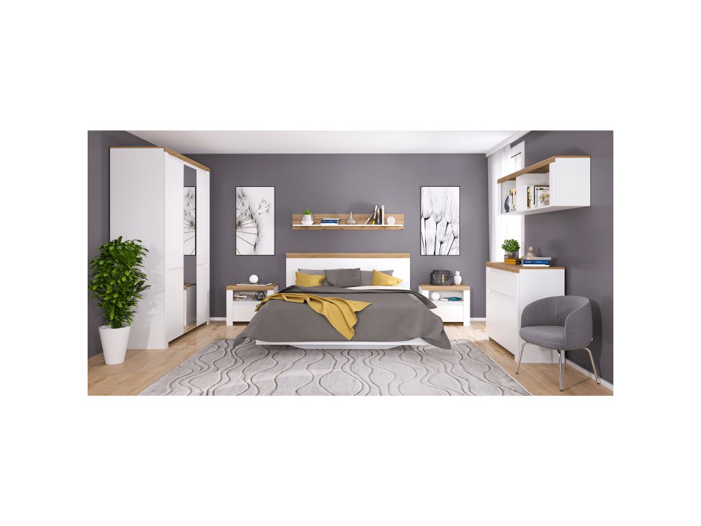 Moderní a prostorná šatní skříň JANKO 5D kombinuje elegantní design s praktickým úložným řešením. Bílý extra vysoký lesk v kombinaci s dekorem dub wotan dodá vaší ložnici či předsíni svěží a luxusní vzhled.