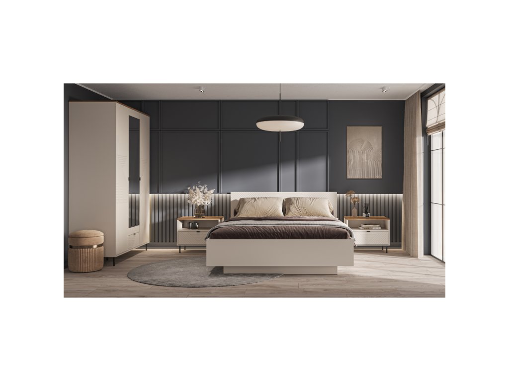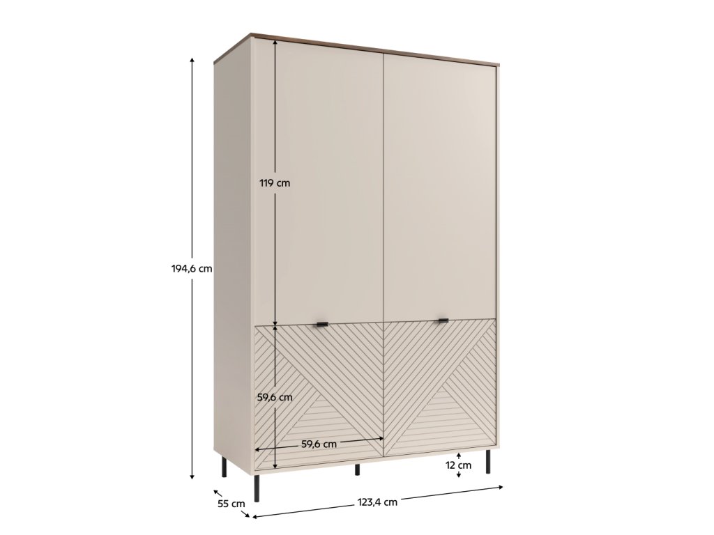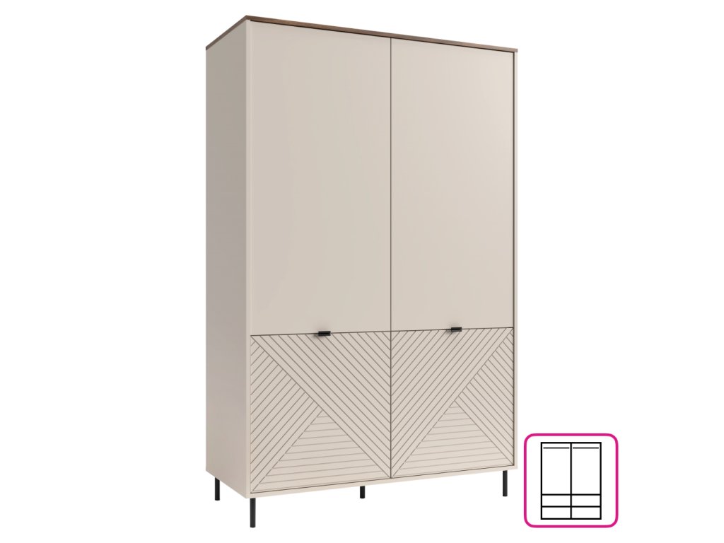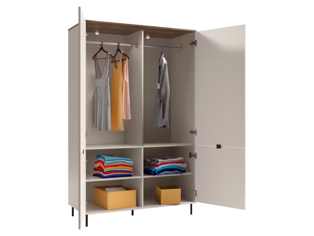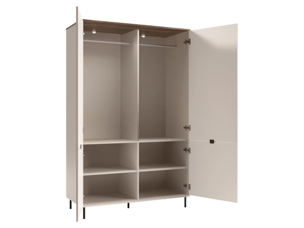 Vnitřní prostor skříně je rozdělen na dvě části: k dispozici jsou dvě věšákové tyče pro přehledné zavěšení oblečení a policová část pro uložení doplňků, prádla či sezónních věcí. Čtyřdveřové provedení zajišťuje pohodlný přístup do všech oddílů bez omezení. Dekorativní dvířka dodávají skříni moderní vzhled, který se hodí do současně zařízených ložnic i šaten.