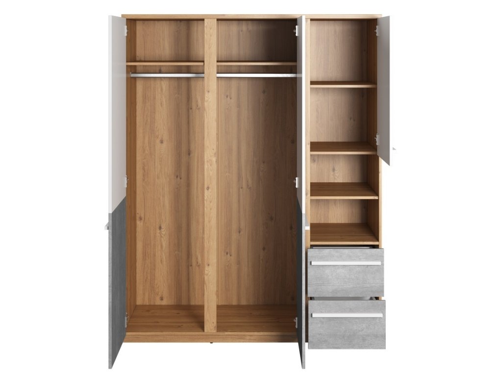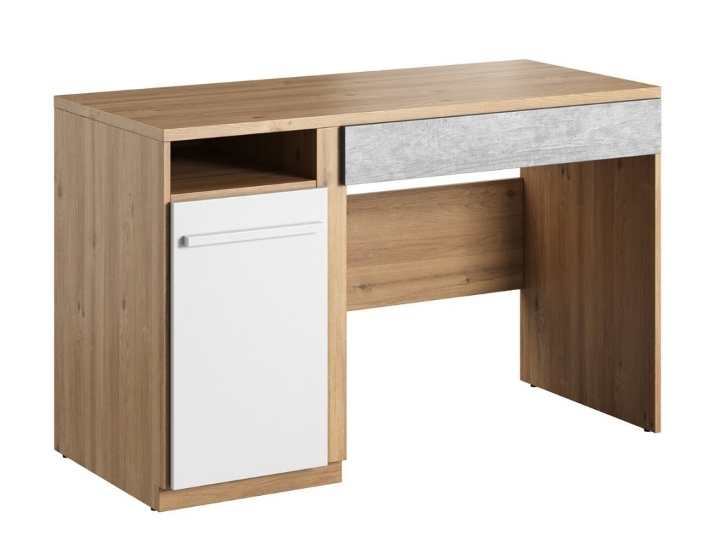 Moderní dětská sestava je ideálním řešením pro funkční a stylově vybavený dětský pokoj. Korpus nábytku je vyroben z desky LTD v barevném provedení dub nash, zatímco dvířka a zásuvky kombinují šedou a bílou barvu, což dodává sestavě svěží a moderní vzhled.