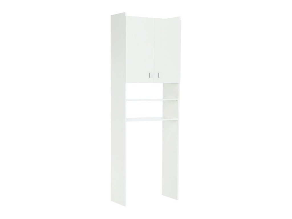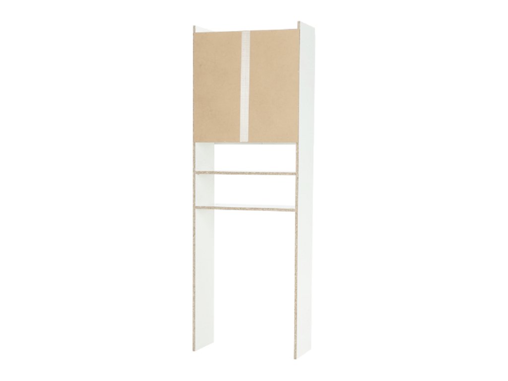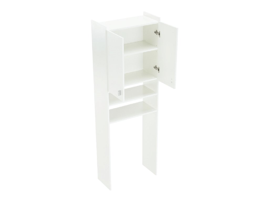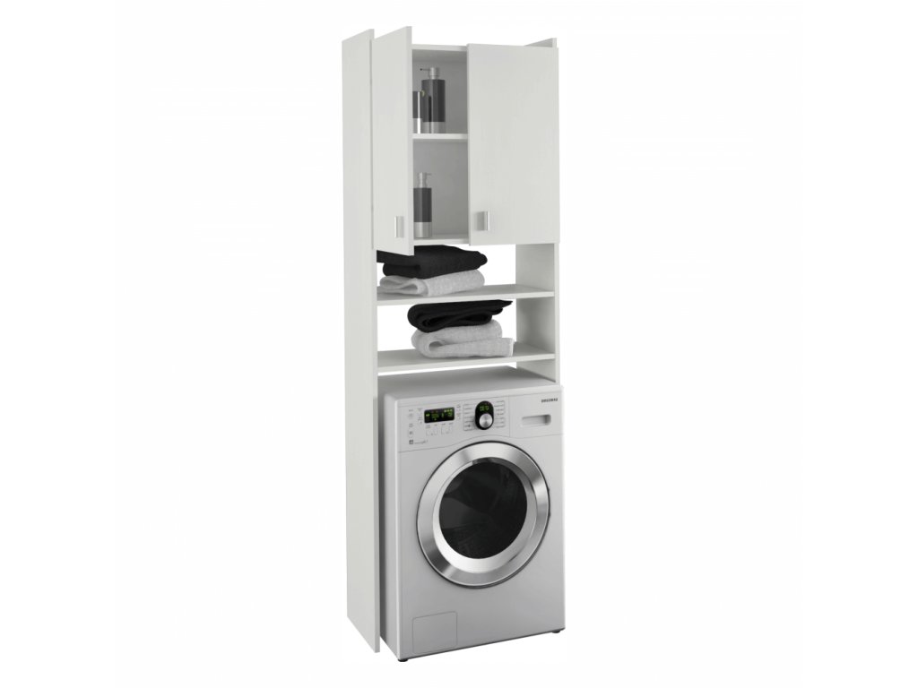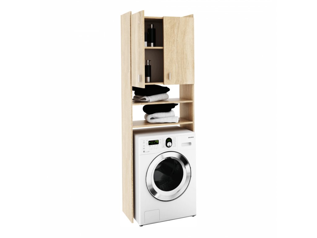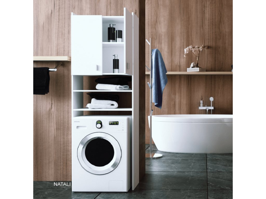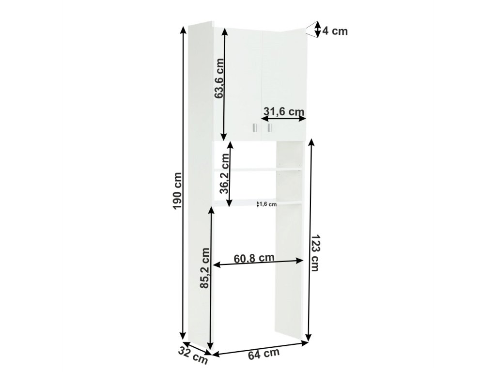 Rozměry skříně: 64 × 32 × 190 cm (ŠxHxV), s prostornou částí na pračku 60,8 × 32 × 85,2 cm a dvoudveřovou skříňkou pro ukládání pracích prostředků. Regálová police o výšce 36,2 cm umožňuje pohodlné uspořádání ručníků, košů nebo čisticích potřeb. Přečnívající část nad skříňkou 4 cm dodává elegantní vizuální detail.