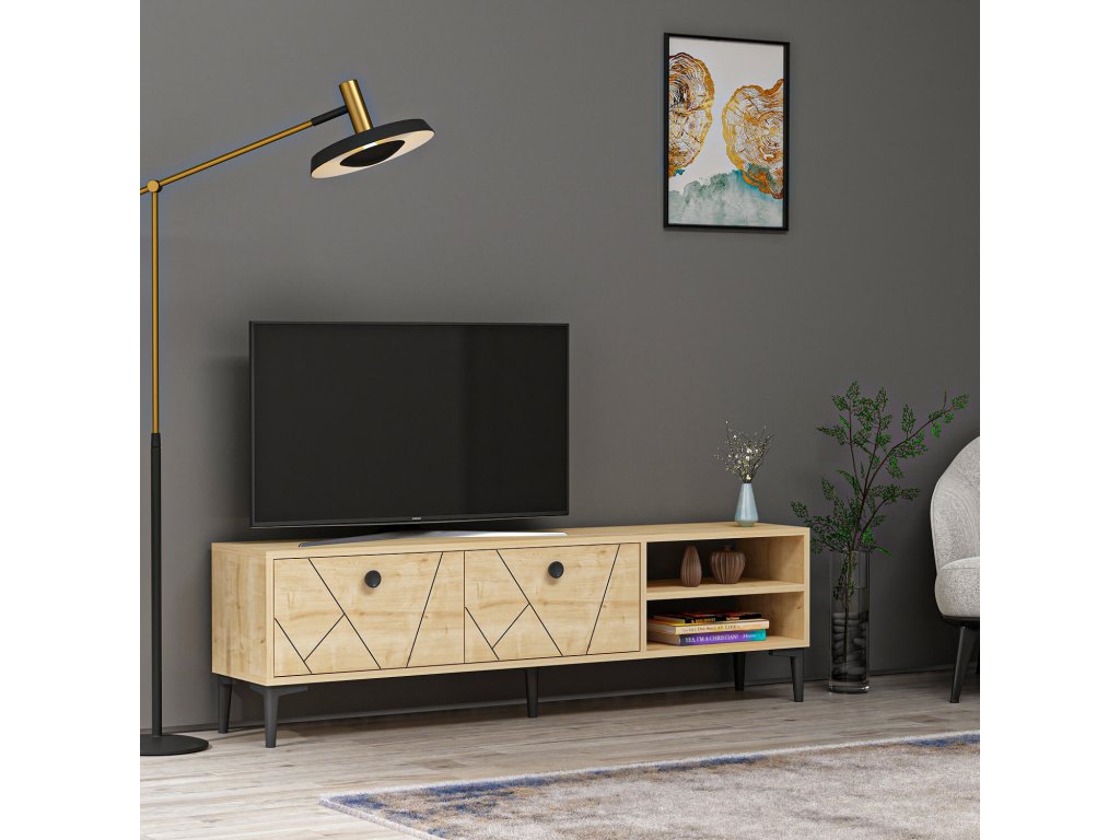 TV stolek OSMOND spojuje moderní minimalistický design s praktickým úložným prostorem, díky čemuž se stane elegantním a funkčním doplňkem vašeho obývacího pokoje. Jeho přírodní dubový dekor dodává interiéru teplý, harmonický a nadčasový vzhled, který se snadno sladí s ostatním nábytkem.