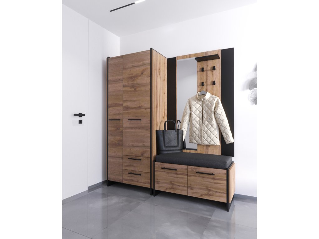 Hledáte praktické a stylové řešení pro vstupní halu nebo ložnici? Věšákový panel AMONI spojuje moderní design s maximální funkčností. Elegantní kombinace dubu Wotan a černých prvků dodá vašemu interiéru šmrnc, zatímco zabudované zrcadlo ulehčí každodenní přípravy.