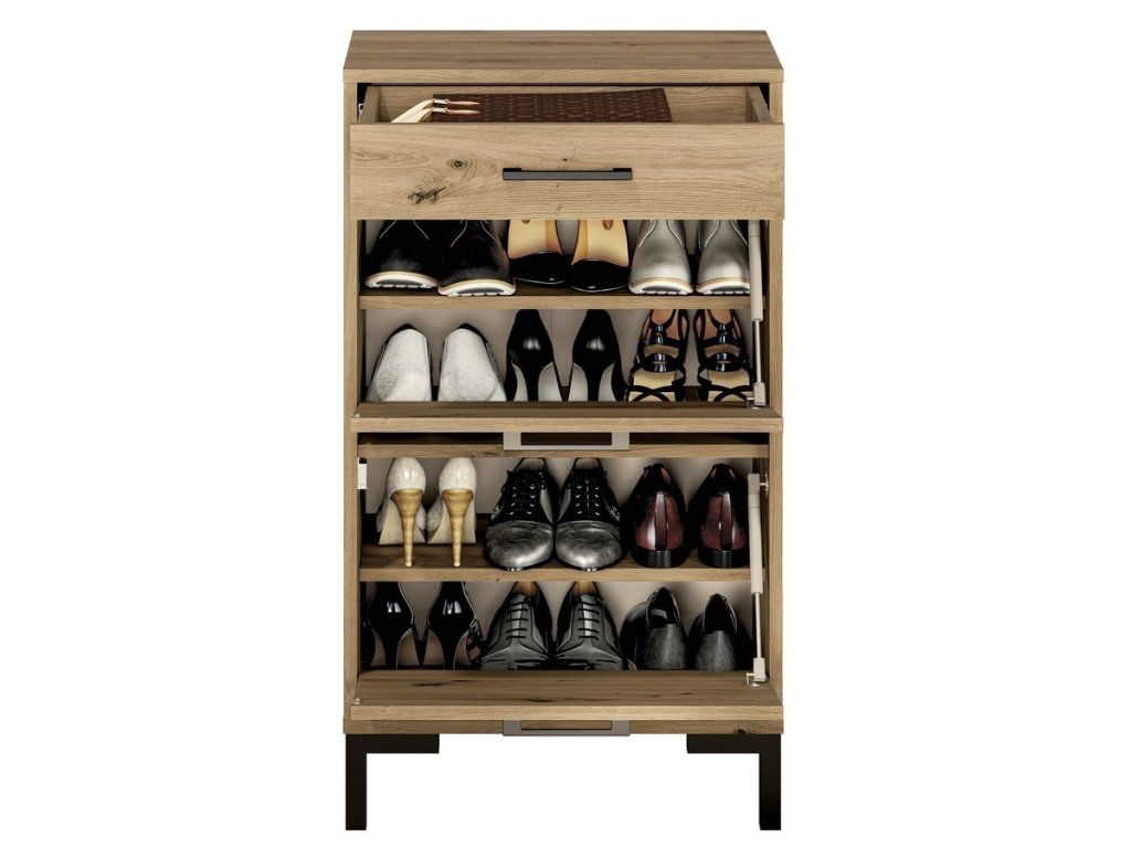 Botník je vyroben z kvalitní LTD desky, která zajišťuje pevnost, odolnost a dlouhou životnost. Výklopná dvířka umožňují rychlý a pohodlný přístup k obuvi, a horní zásuvka poskytuje prostor pro drobné předměty a doplňky. Plastové úchyty doplňují moderní vzhled a usnadňují manipulaci.