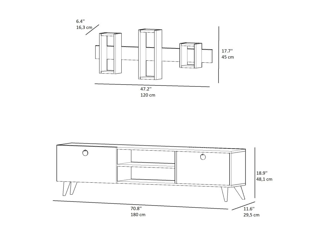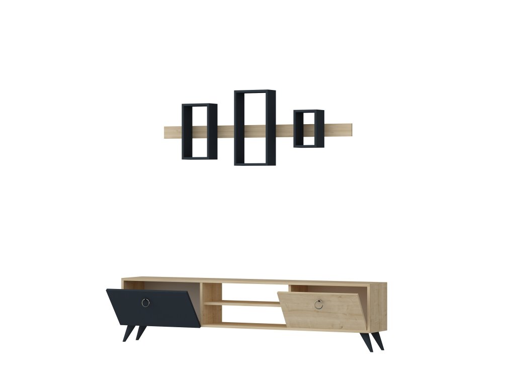 Obývací stěna YOKA kombinuje elegantní vzhled a funkčnost, která přináší do obývacího pokoje styl a přehled. Sestava zahrnuje televizní stolek a nástěnnou polici, které dohromady tvoří harmonický a moderní celek.