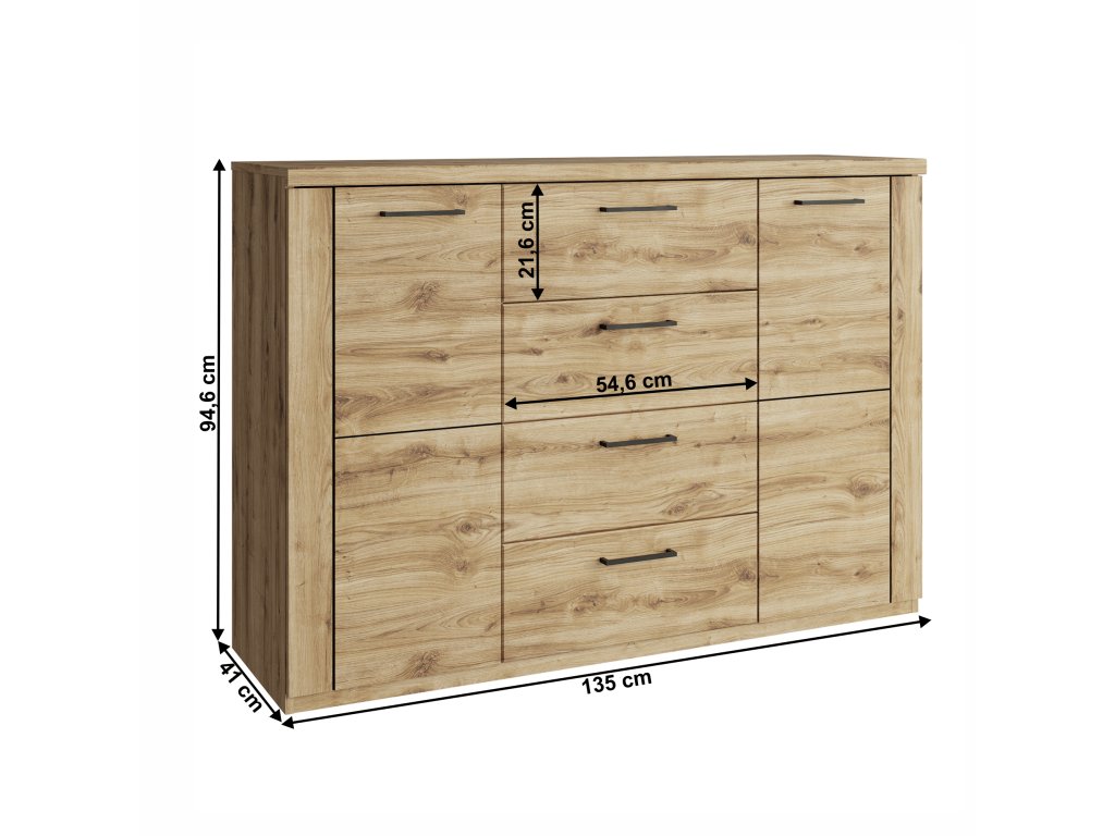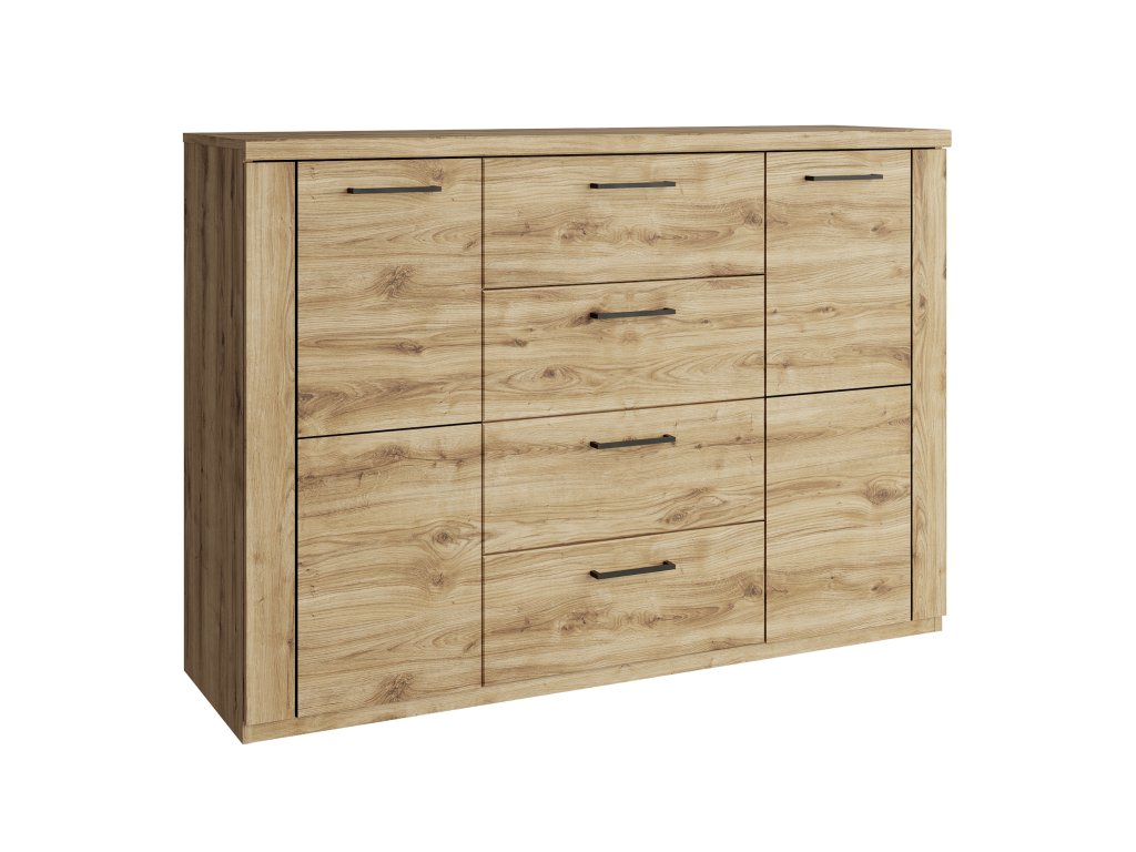 Moderní vzhled: Kombinace dub navarra a černých plastových úchytek dodává komodě nadčasový styl.